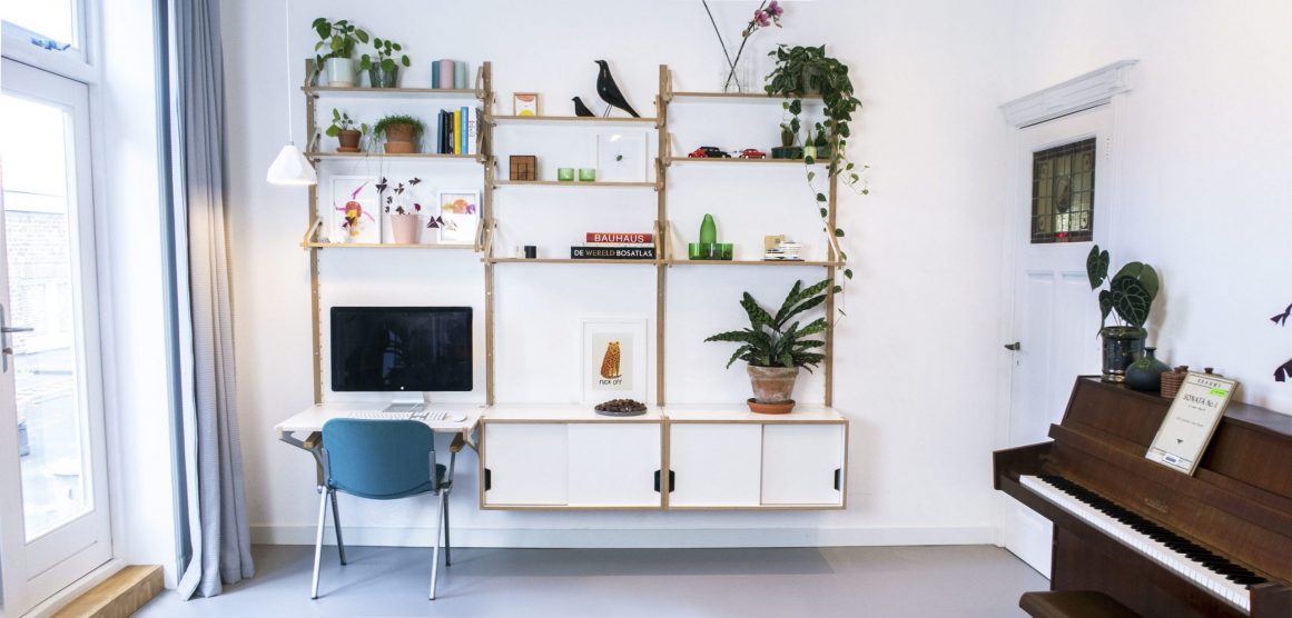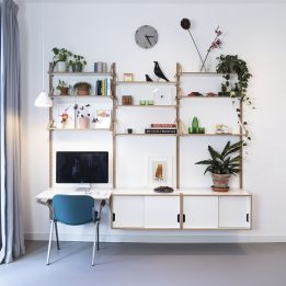 Ge’staltung’s Mauer Wandschap Systeem is een modulair kastensysteem waarmee je jouw ideale kast samenstelt. In basis bestaat het systeem uit een aantal onderdelen; drie planken met verschillende dieptes, twee maten lades, een kastje met schuifdeurtjes en een bureau module, in wit of zwart uitgevoerd. Daarbinnen zijn alle combinaties en samenstellingen mogelijk; van drie plankjes voor de boeken thuis tot een hele winkelinrichting.
