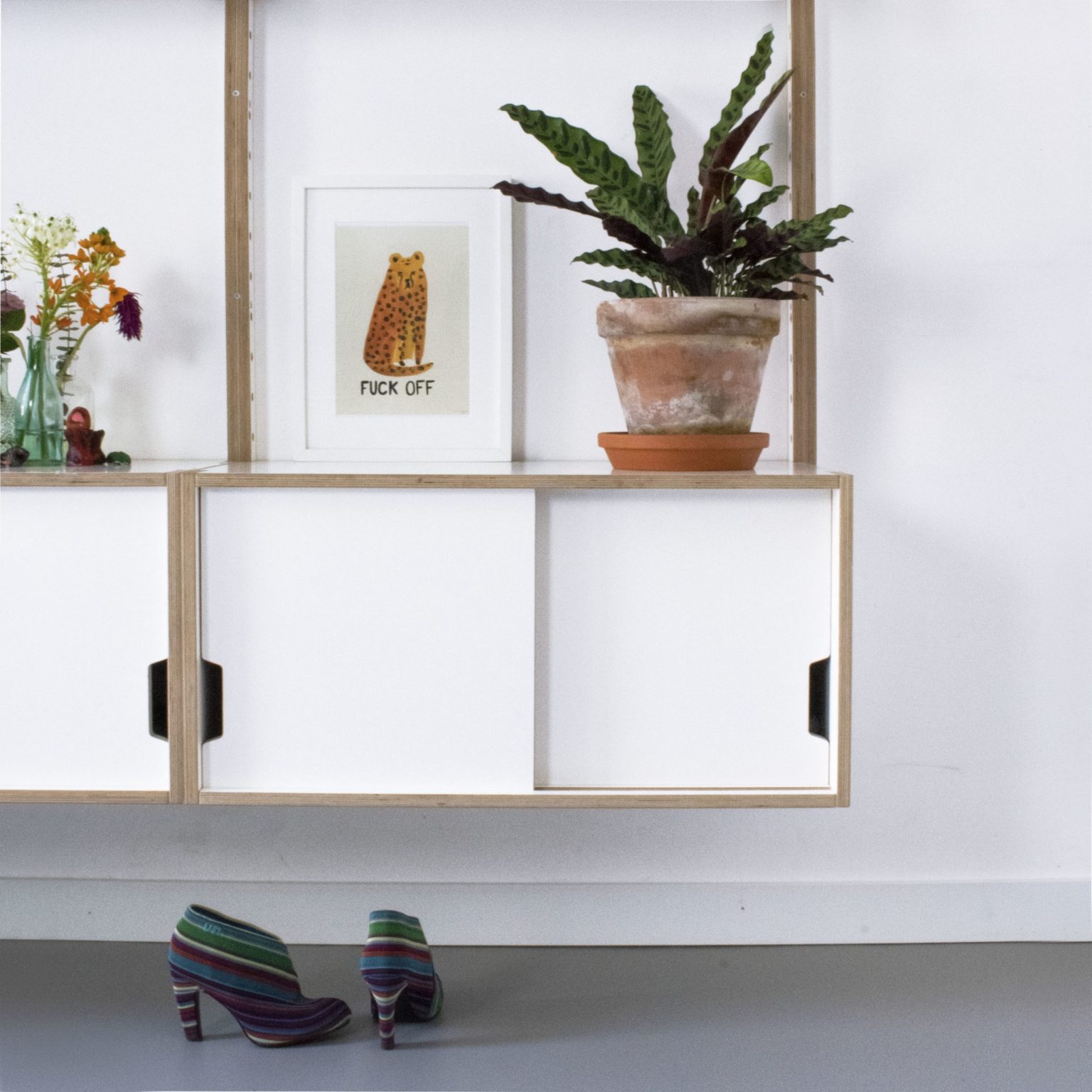 Ge’staltung’s Mauer Wandschap Systeem is een modulair kastensysteem waarmee je jouw ideale kast samenstelt. In basis bestaat het systeem uit een aantal onderdelen; drie planken met verschillende dieptes, twee maten lades, een kastje met schuifdeurtjes en een bureau module, in wit of zwart uitgevoerd. Daarbinnen zijn alle combinaties en samenstellingen mogelijk; van drie plankjes voor de boeken thuis tot een hele winkelinrichting.