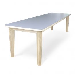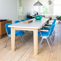 Ranke Olifant Tisch is een grote, robuuste tafel. Met een massief eikenhouten frame en verjongde poten onder een hoek van 45 graden. Het blad heeft een kern populierenhout en een grijze HPL toplaag. Dit is een tafel waar je aan kunt vergaderen, in het weekend de krant aan leest, maar evengoed uitgebreid aan kunt dineren (om daarna op de tafel te dansen…).