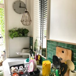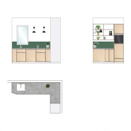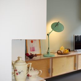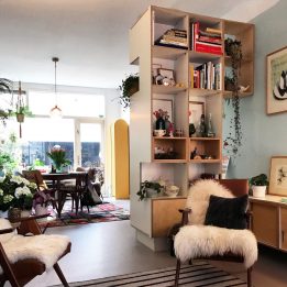 Men neme: een op maat gegoten betonnen blad, naturel berkenhouten deurtjes en wit betonplex. Et voilà: een custom made keuken voor Hans en Annemiek. Voeg daaraan toe: een grote kast/opbergmeubel in dezelfde stijl, met zelfde technieken en materialen en de woonkamer spreekt dezelfde vormentaal als de keuken.