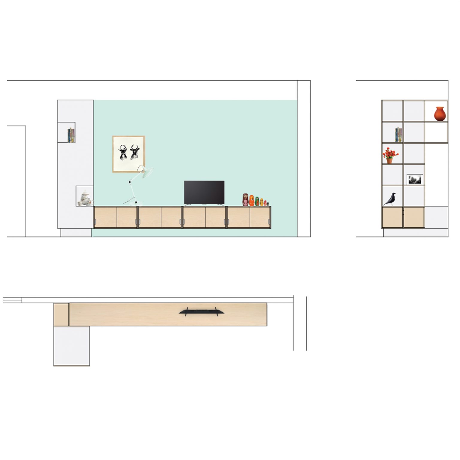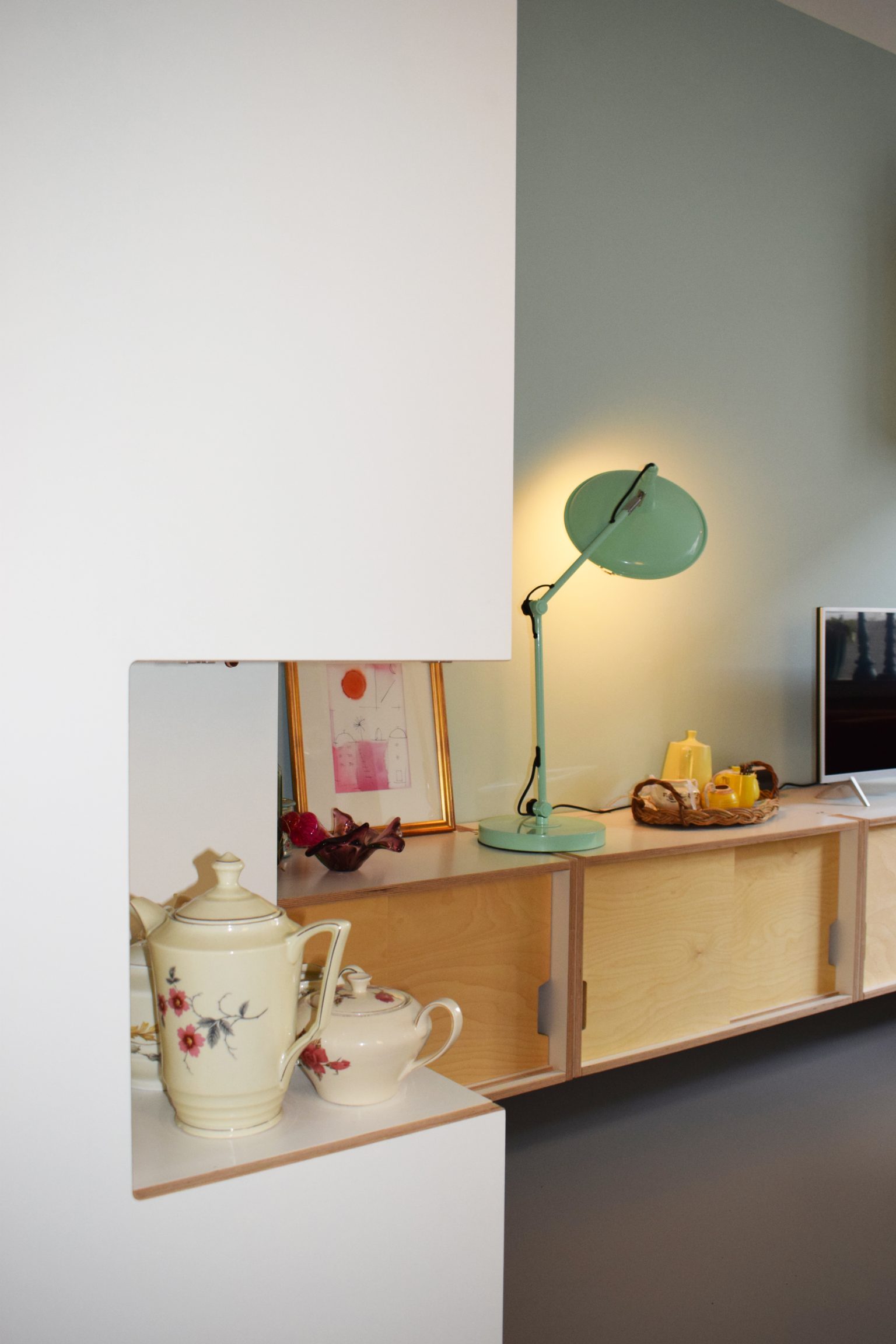 Men neme: een op maat gegoten betonnen blad, naturel berkenhouten deurtjes en wit betonplex. Et voilà: een custom made keuken voor Hans en Annemiek. Voeg daaraan toe: een grote kast/opbergmeubel in dezelfde stijl, met zelfde technieken en materialen en de woonkamer spreekt dezelfde vormentaal als de keuken.