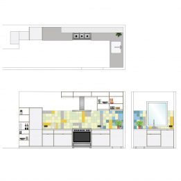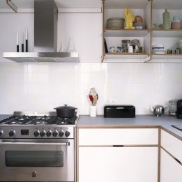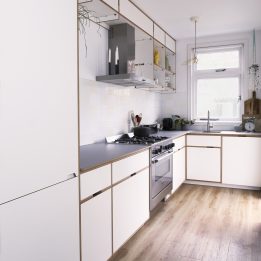 In de keuken van Sanne en Jean is gewerkt met wit betonplex, dat door zijn frisse uitstraling een passend geheel vormt met de lichte achterkamer. Door de warme, houtkleurige kopste kanten van het materiaal wordt de keuken minimalistisch geaccentueerd. Het grijze polaris op het aanrecht komt terug in de door Ge’staltung ontworpen eettafel.