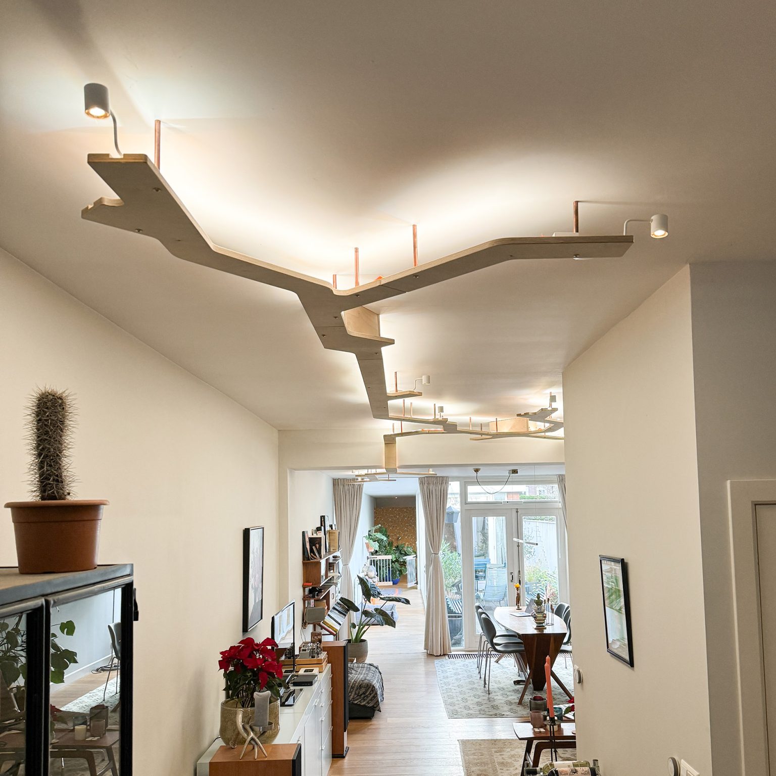 Met de Vertakte Lamp Rinne hebben we juist een roomconnector gecreëerd die als hij uit staat al een visueel spektakel is maar ook zorgt voor fijn licht gedurende de dag en ’s avonds bijgesteld kan worden om het huis te voorzien van een sfeervolle ambiance.